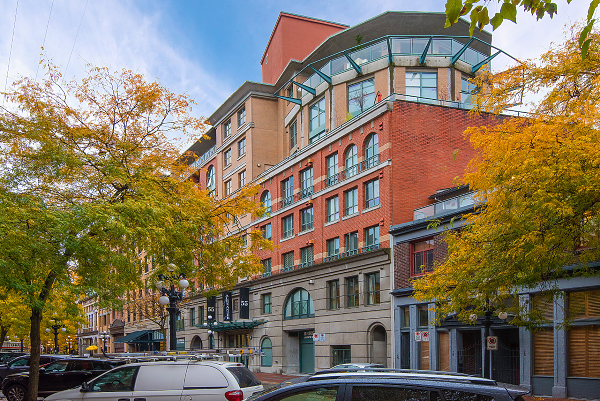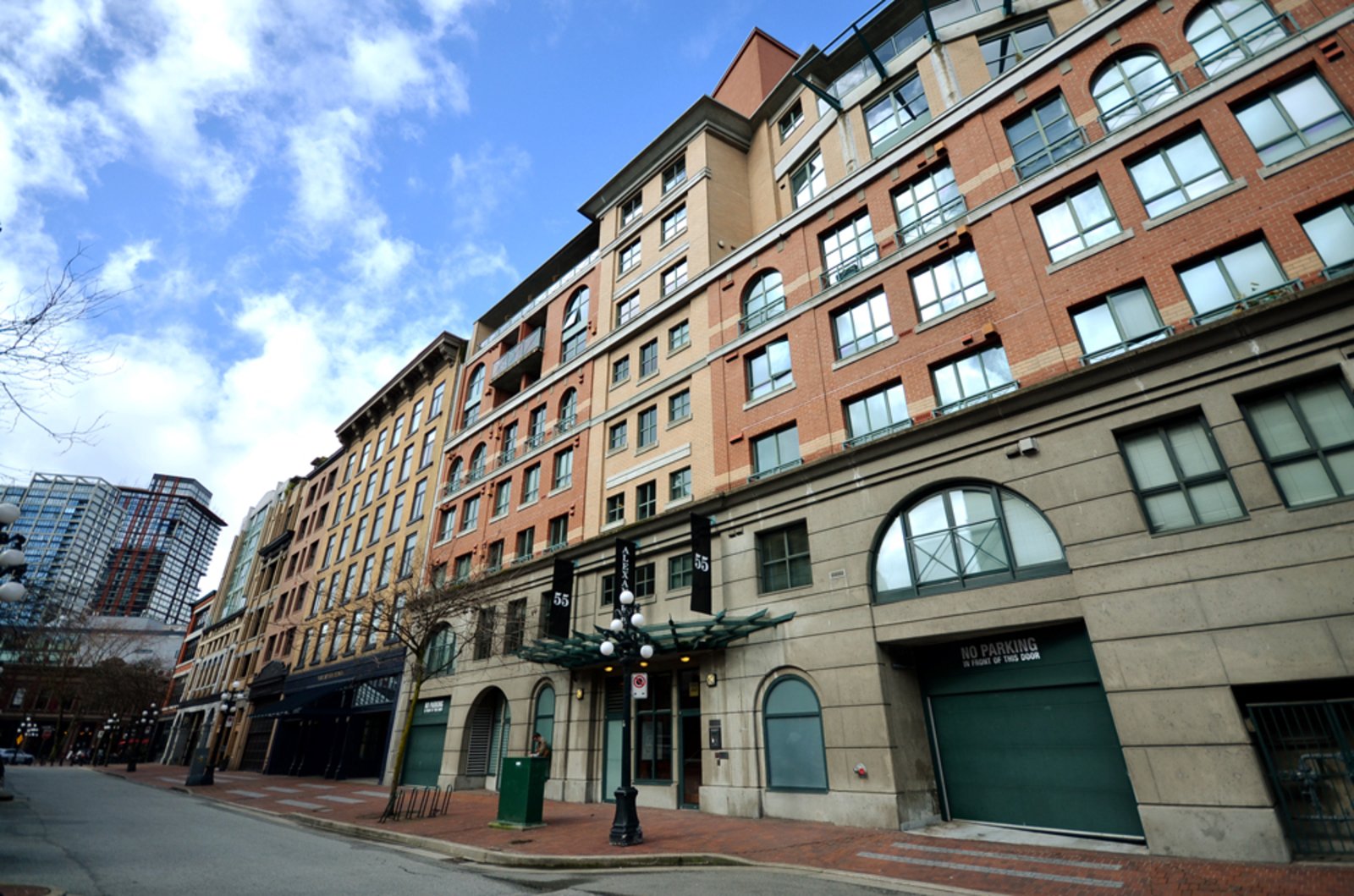 55 Alexander was designed to reflect Gastown’s character and appeal to sophisticated tastes. The exterior features a brick facade with elegant arched windows and neoclassical metal detailing. There are 38 suites and 13 different floor plans, some featuring unobstructed Burrard Inlet views, exterior French doors, wraparound terraces, sliding interior partition walls of sandblasted glass, and kitchen pantries. You can also find cherry-stained wood entry doors and cabinetry, granite countertops and pedestal sinks, and mosaic tile flooring.  This 1999 concrete build has a fully rain-screened exterior and so much style.